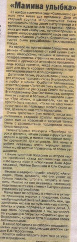 Статья в газете "Деловая пятница" от 14 декабря 2018 г Рожковой Н.Е. о праздинке "Мамина улыбка"