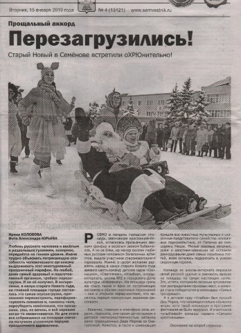 Публикация в газете "Семеновский вестник" от 15 января 2019 г о конкурсе "Новогодняя перезагрузка" 1стр