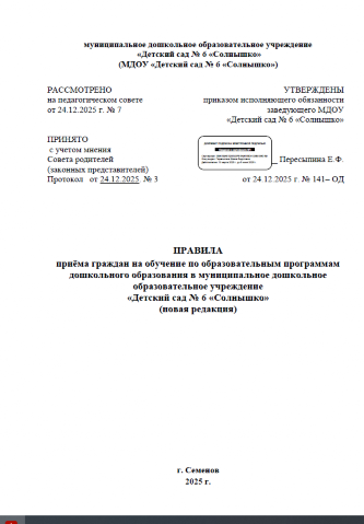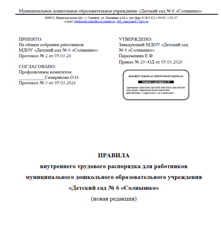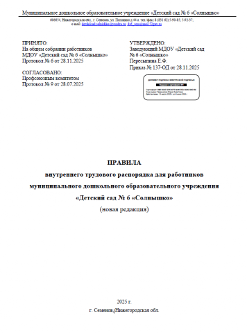 Правила внутреннего трудового распорядка для работников муниципального дошкольного образовательного учреждения "Детский сад № 6 "Солнышко"
